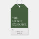 This witty tag features the bold, amusing statement, "THIS LOOKED EXPENSIVE." presented in large, white serif capital letters against a rich, sophisticated forest green background. The design employs a clean color block, contrasting the deep green with a crisp white lower section for writing personal details. This chic, funny design adds a playful, casually self-aware statement to your gifts, guaranteeing a laugh before the unwrapping even begins!