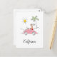 Diese lustige und niedliche kalifornische Postkarte zeigt eine Cartoon-Illustration einer mittelalterlichen Frau, die ihr extravagantes Auto auf der Autobahn fährt. Im Hintergrund stehen die Sonne und die Palmen. Die Illustration erfolgt in einer sehr einfachen Stift- und Tintentechnik mit einigen Farbpunkten.