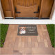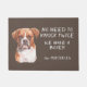 "Es ist nicht nötig zweimal zu klopfen, wir haben einen Boxer", sagt diese niedliche Türmatte. Der Text ist auf der rechten Seite weiß, während ein Bild eines braunen und weißen Boxerdogs auf der links Seite ist. Alles ist auf graubraunem Hintergrund platziert.