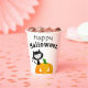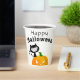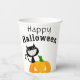 Diese lustigen Halloween-Party-Tassen für die Kleinen sind mit einer albernen und lächelnden schwarzen Katze ausgestattet, die auf einem hellen orangefarbenen Jack o' Laternenkürbis sitzt. Der Text lautet "Happy Halloween" in bedrückter Schrift.