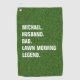 A bold Lawn Mowing Legend golf towel featuring clean white typography set against a realistic grass-textured background.