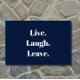 Schließlich ein inspirierendes Sprichwort für die introvertierten unter uns. "Lebe. Lachen. Verlass." verkündet diesen humorvollen Türmchen, der für Introvertierte, für Antisoziale und sozial Unbehagliche ist, die Gäste mit etwas Abneigung und vielleicht sogar etwas Angst empfangen. Einfache, moderne weiße Typografie auf einem klassischen marineblau Hintergrund. Unerwartet, sonderbar und nur ein wenig sarkastisch, ist diese lustige Türmatte perfekt für diejenigen, die dunklen, trockenen Spaß schätzen und sich nicht scheuen, ihn mit ihren Besuchern zu teilen (von denen sie hoffen, bald verlassen).