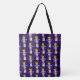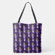 Eine Tasche mit einem charmanten, aber lustigen Muster. Entworfen mit einem skurrilen Lama, das eine große rosa Blase beim Kaugummi bläst. Tragen einer Goldkrone und einer schwarzen Bogen-Krawatte. Dunkler lila Hintergrund.