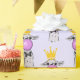 Papier mit einem charmanten, aber lustigen Muster. Entworfen mit einem skurrilen Lama, das eine große rosa Blase beim Kaugummi bläst. Tragen einer Goldkrone und einer schwarzen Bogen-Krawatte. Lila Hintergrund.