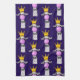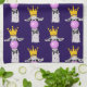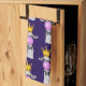 Küchenhandtuch mit einem charmanten, aber lustigen Muster. Entworfen mit einem skurrilen Lama, das eine große rosa Blase beim Kaugummi bläst. Tragen einer Goldkrone und einer schwarzen Bogen-Krawatte. Dunkler lila Hintergrund.