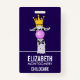 Nennen Sie Abzeichen mit einem whimsical Lama, das eine große rosa Blase bläst. Tragen einer Goldkrone und einer schwarzen Bogen-Krawatte. Dunkler lila Hintergrund.