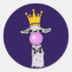 Ein Aufkleber mit einem skurrilen Lama, das beim Kaugummi eine rosa Blase bläst. Tragen einer Goldkrone und einer schwarzen Bogen-Krawatte. Dunkler lila Hintergrund.