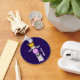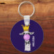 Ein Schlüsselanhänger mit einem skurrilen Lama, das eine große rosa Blase bläst. Tragen einer Goldkrone und einer schwarzen Bogen-Krawatte. Dunkler lila Hintergrund.