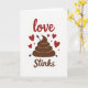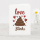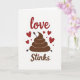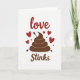 This greeting card features a funny, dark take on romance with a simple white background. At the top, the word “love” appears in deep red flowing letters, centered and easy to spot. In the middle, there’s a stacked swirl of dark brown poop drawn with soft shading to give it a thick, creamy look. Two Cupid arrows pierce through it from opposite angles, each with a dark shaft and feathered ends, like they’ve pinned it in place. Small red hearts float around the swirl, adding a sweet contrast to the joke 💘❤️. At the bottom, the card reads “Stinks.” in brown letters, and the “i” is dotted with a tiny red heart for one extra gag. It’s a cheeky card for someone who likes love jokes that are a little gross but still kind of cute 😘.
