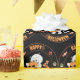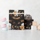 Ein niedlicher und lustiger Mummy-Spaziergang bringt halloween Kürbis mit Bonbons und Kuchen, Spinnennetze und oben auf Hexe, Happy Halloween Halloween-Party Packpapier auf schwarzem Hintergrund.