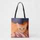 Diese lustige Tasche ist mit einer niedlichen, leuchtend orangefarbenen Tabbattacke versehen, die digital aus einem Foto gemalt wurde. Hellorange, braune Augen. Mischsche aussehende Katze gelegt. Kupfer, Ingwerfarben. Bildrecht Marg Seregelyi Fotografie.