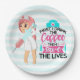 Papierteller für Veranstaltungen zum Thema Krankenschwester mit einem humorvollen Sprichwort: Zuerst trinke ich den Kaffee, dann rettete ich das Leben. Ideal für Krankenschwestern. Eine Darstellung einer Krankenschwester, die eine niedliche, altmodische Krankenschwester trägt und eine riesige, hypodermische Nadel trägt.