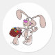 Dieses Bild zeigt einen Cartoon-Hasen mit langen Ohren, einer rosa Nase und großen Zähnen, die einen Korb voller bunter Ostereier tragen. Das spielerische Design macht es zu einem lustigen und festlichen Aufkleber für Osterfeiern.