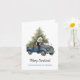 Funny Panda in Blue Retro Van Xmas Grußkarte. Wasserfarbe zeichnend von einem niedlichen weißen Panda Bär in einem blauen Vintagen LKW und Weihnachtsbaum. Personalisierter Text.