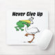 Funny Maus Pads mit einer positiven Note. Gib nie auf, dass ein Storch einen Frosch schluckt, der seine Hände um den Storchenhals hat. Gutes Geschenk und Inspiration für Freunde und Familie.