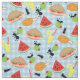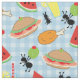 Die Cartoon-Picknickspeisen wie Sandwiches, gebratene Hühnertromsticks, Wassermelone in Scheiben geschnitten, Limonade und natürlich Ameisen! Alles auf einem blauen Gingham Muster picknicken Decke Hintergrund. Dieses humorvolle Stoffdesign ist niedlich für Sommerpicknicks oder für eine Touch Launen in Ihrer Zuhause.
