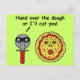 Dieses alberne, humorvolle Pun-Design zeigt ein Pizzaslicer-Sprichwort zu einer verängstigten Cartoon-Pizza: "Gib den Teig oder ich schneide dich!" Der Pizzabschneider trägt eine schwarze Maske wie ein Mugger und die Pizza macht ein erschrecktes Gesicht in Form eines runden Pepperoni-Mundes, Olivenaugen und einer Pilznase. Die Farbe des grünen Hintergrunds ist anpassbar.