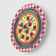 Diese Wanduhr ist das perfekte Geschenk für jeden Pizzafreund. Sie bietet eine Deluxe Pizza auf einer silbernen Pizzeria über einem klassischen roten Gingham-Druck, ähnlich wie Tischdecken, die man in klassischen Pizzarien vorfindet. Ihr Familienname und einjähriger Text wird direkt auf dem Pizzapanbild angezeigt.