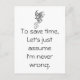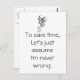 Komfortable Anführungskarte mit Tätowierdesign im Schmetterling. Die Postkarte lautet: "Um die Zeit retten, nehmen wir einfach an, dass ich nie falsch liege."