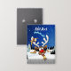 A Funny cartoon reindeer with a bright red nose and large white antlers, adorned with a red and gold bow, peeks through an open window. Outside, a snowy landscape with silhouetted pine trees and a small, glowing house is visible under a dark blue, star-filled night sky. Santa's sleigh pulled by reindeer is flying in the distance. The scene evokes a festive and whimsical Christmas atmosphere. Original Vector Art Copyright BluedarkArt TheChameleonArt.