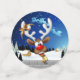A Funny cartoon reindeer with a bright red nose and large white antlers, adorned with a red and gold bow, peeks through an open window. Outside, a snowy landscape with silhouetted pine trees and a small, glowing house is visible under a dark blue, star-filled night sky. Santa's sleigh pulled by reindeer is flying in the distance. The scene evokes a festive and whimsical Christmas atmosphere. Original Vector Art Copyright BluedarkArt TheChameleonArt.