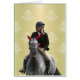 Der als Reithund verkleidete, lustige Boxerhund zeigt auf einem grauen Pferd mit roten, spitzen Teufelsohren auf einem goldgelben, Vintagen Damashintergrund einen Jumping. Für passende Produkte und verrücktere Tiere, die als Leute gekleidet sind, besuchen Sie das VINTAGEPRINTSTORE. Design Copyright Oconnart.