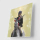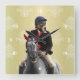 Der als Reithund verkleidete, lustige Boxerhund zeigt auf einem grauen Pferd mit roten, spitzen Teufelsohren auf einem goldgelben, Vintagen Damashintergrund einen Jumping. Für passende Produkte und verrücktere Tiere, die als Leute gekleidet sind, besuchen Sie das VINTAGEPRINTSTORE. Design Copyright Oconnart.