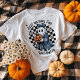 Feiern Sie mit diesem Retro-Coquette Halloween-Geist-T - Shirt eine leckere Saison im Stil. Mit einem niedlichen Geist gekleidet in einem denim-artigen Bogen und Blumengestein, der eine lächelnde Jack-o’-Laterne vor einer Vintagen Schachbrettkulisse hält, mischt dieses Design Spaß, Nostalgie und trendige Kokettsdetails. Ideal für Oktober-Liebhaber, die "nur zu Halloween gewartet" sind. Eine lustige Auswahl für Kürbispflasterausflüge, Trick-oder-Leckerei-Events, Halloween-Party oder lässige Herbstoutfits.