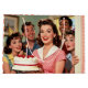 A fun surprise birthday party gift bag. The front illustration is a group of retro mid-century friends gathering to surprise someone for their birthday holding a cake with funny awkward expressions.