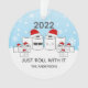 Ein lustiges und festliches Urlaubssornament-Design mit 2 Erwachsenen- und 5 Kindertoilettenpapier mit Weihnachtsmannmützen-Sprichwort "Just Roll With It". Ein leichtes Lachen über die Knappheit an Toilettenpapier während COVID Quarantäne und Veranstaltungen. Personalisieren Sie den Text und fügen Sie dem Ornament Ihre Namen hinzu.