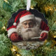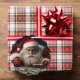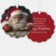 This scalloped-edge ornament card features a humorous photo of Santa Claus leaning over a pile of dollar bills, clutching a single buck with a serious stare—perfectly capturing the spirit of holiday inflation. The reverse side includes a witty rhyme about rising costs and Santa being broke, along with a customizable family name for a personal touch. A clever and festive way to share seasonal cheer with a wink and a smile.