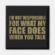 Wenn Sie lustige sarkastische Zitate oder großartige humorvolle Entwürfe mögen, dann ist dieser ursprüngliche Slogan "Ich bin nicht verantwortlich für das, was mein Gesicht tut, wenn du sprichst" für Sie. Es ist ein großartiges Geschenk für Ihre Familie, Freunde oder Sie selbst! Dieses Design ist ideal für alle, die Sarkasmus und Spaß Lieben. Wenn Ihnen dieses lustige Zitat gefällt, Karo mehr ähnliche Kunstwerke im Omitay Store heraus. Bleibe sicher und danke für die Unterstützung eines lokalen Künstlers.