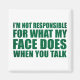 Wenn Sie lustige sarkastische Zitate oder großartige humorvolle Entwürfe mögen, dann ist dieser ursprüngliche Slogan "Ich bin nicht verantwortlich für das, was mein Gesicht tut, wenn du sprichst" für Sie. Es ist ein großartiges Geschenk für Ihre Familie, Freunde oder Sie selbst! Dieses Design ist ideal für alle, die Sarkasmus und Spaß Lieben. Wenn Ihnen dieses lustige Zitat gefällt, Karo mehr ähnliche Kunstwerke im Omitay Store heraus. Bleibe sicher und danke für die Unterstützung eines lokalen Künstlers.
