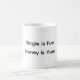 Eine Tasse mit einem einfachen Design, aber mit einer aussagekräftigen Botschaft: Single zu sein macht Spaß, aber Geld ist auch nett, für sich selbst zu haben, stattdessen eine Freundin/Freundin haben