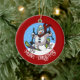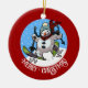 Ein fröhlicher Schneemann auf einer Keramik für deinen Weihnachtsbaum. Verwenden Sie "Personalisieren Sie diese Vorlage", um den Text "Frohe Weihnachten!" zu optimieren und ein einzigartiges, individuelles Geschenk zu erstellen. Mit einem niedlichen Schneemann mit Karottennase und Kohleaugen, Schneeschlitten durch den Schnee, in Wollhut und Tartan Schal, auf rotem Hintergrund. Ein optimistisches Bild für Weihnachten oder den ganzen Winter.