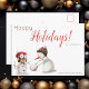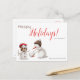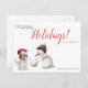 Niedliche und lustige personalisierte Urlaubspostkarte mit einer Illustration eines Schneemanns, der auf die Eule wütend war und seinen Freund kaputtgemacht hat. Illustriert und entworfen von Patricia Alvarez.