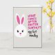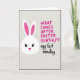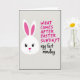 This card features a simple long-eared spring animal in white on the left, set against a lightly textured pale gray background with a dark border. Its big black eyes with tiny lashes and a small pink nose give it a sweet, almost flirty curiosity, as if it’s sharing an inside joke with someone just off to the right 🐰. The tall ears rise up with bright pink inner sections, adding a pop of color that feels like a blush. On the right side, the question “WHAT COMES AFTER EASTER SUNDAY?” appears near the top in uppercase magenta lettering. Beneath it, the answer “egg fart monday” sits lower in looser black cursive-style writing, creating a funny contrast between the neat question and the cheeky reply. The layout leaves plenty of open space, so the character and the words feel like they’re in a light back-and-forth, like friends teasing each other 🌷. A faint diagonal grain runs across the gray background behind the white face and the pink-and-black text.