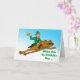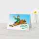 Machen Sie dieses St. Patrick's Day Lager als das Leben. Der lustige St. Patrick's Day Grußkarte mit einem Kobobold, der ein Bier hält und auf einem Frosch reitet. Der Frosch fliegt durch den hellblauen Himmel. Der Kobold ist in einem grünen Anzug gekleidet, Strümpfe gestreift und trägt einen grünen Hut. Art, Bild und Vers Copyright © Shoaff Ballanger Studios, 2024.