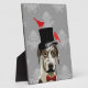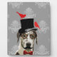 Niedliche Steampunk-Hundsmaschine in einer Hut- und Bogen-Krawatte, digitaler Collage auf grauem Vintagem Damast-Hintergrund, und rote Vögel. Für passende Produkte und humorvollere Tiercharaktere besuchen Sie den VINTAGEPRINTSTORE.