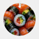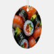 Weihnachtsschmuck mit einem realistischen Bild eines Tellers Sushi. Auf der Rückseite ist ein niedlicher Weihnachtsstaubpun und ein Ort für Sie, um eine individuelle Nachricht hinzuzufügen.