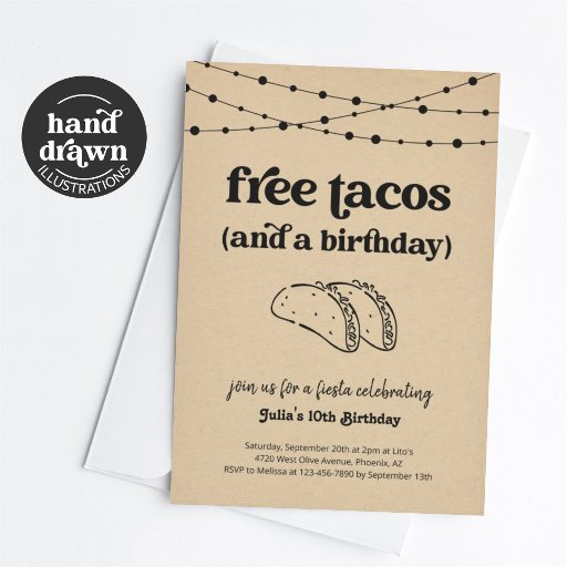 Free Tacos (and a Birthday). Enjoy a fun birthday party invitation that puts the spotlight on... tacos! Artwork is hand drawn. Coordinating items are available in the 'Taco Birthday Party' Collection within my store.