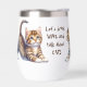 Dieses Wein-Taumelglas hat zwei Bilder von bezaubernden gestreiften Kätzchen aus Tabby. Der braune Text zwischen den Bildern sagt "Lass uns WEIN trinken und über CATS reden". Eine Seite hat auch Ihren Namen oder Monogramm in passender Braun.