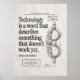 Dieses Kunstwerk im Vintagen Stil der 80er Jahre verbindet ein klassisches Technologiekonzept mit einem zeichnend Imitat. Im Text steht: "Technologie ist ein Wort, das etwas beschreibt, das noch nicht funktioniert". Eine großartige Geschenkidee für Geeks, Programmierer, Techniker und alle, die sich darum kümmern, wie Technologie unser Leben verändert. Erstellt von Piotr Kowalczyk & AI © First publiziert: 24.02.2024.