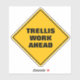 Ein klassisches, gelbes Karo-Warnschild warnt vor Trellis, die in einem dicken schwarzen Sans Serif Schriftart voran arbeiten. Ein Wortspiel auf einem klassischen Schild, Straßenarbeit voraus, Gartenbau, Zaun-Spaß, für Purgola oder Pflanze.