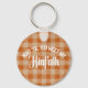 Der sonnige rustikale Schlüsselanhänger mit weißem Text "Wait 'to you meet my kinfolfolfolvolt" und Vintagem, karierten Hintergrund