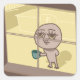 Ein lustiger Aufkleber eines Typ mit einer Tasse, der aus einem Fenster impassiv schaut.