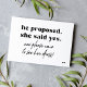 Einfach schwarz-weiß trendige Typografie Hochzeitseinladung mit einer lustigen "er vorgeschlagen, sagte sie ja - jetzt kommen Sie bitte zu ihrem Kleid zu sehen" modernen Zitat-Skript.