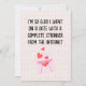 Einzigartige Valentinstag-Karten: Feiern Sie Online-Liebe-Geschichten! Die Valentinenkarte des Internet-Strangers: Eine einzigartige Valentinstag-Karte für den besonderen Menschen, den Sie online getroffen haben. "Ich bin so froh, dass ich mit einem kompletten Fremden aus dem Internet an einem Date war", sagt es alles mit einer Touch Spaß und einer ganzen Menge Liebe.