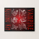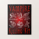 Das Bild ist eine stilisierte Abbildung eines Vampirtötungskits. Die Wörter "VAMPIRE" und "KILLING KIT" sind in einem großen, roten, gotischen Schriftart oben bzw. unten geschrieben. Dazwischen gibt es sechs weiße Skizzen von Gegenständen, die traditionell zur Tötung von Vampire verwendet werden: ein Pfahl und Ballett, eine Bibel, eine Pistole mit Silberkugeln, eine Flasche heiligen Wassers, Knoblauch und ein Kreuz. Perfektes Geschenk für Goten und Vampirliebhaber.