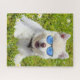 Die Sonne auf grünem Gras ist ein lustiger weißer Husky-Welpe.